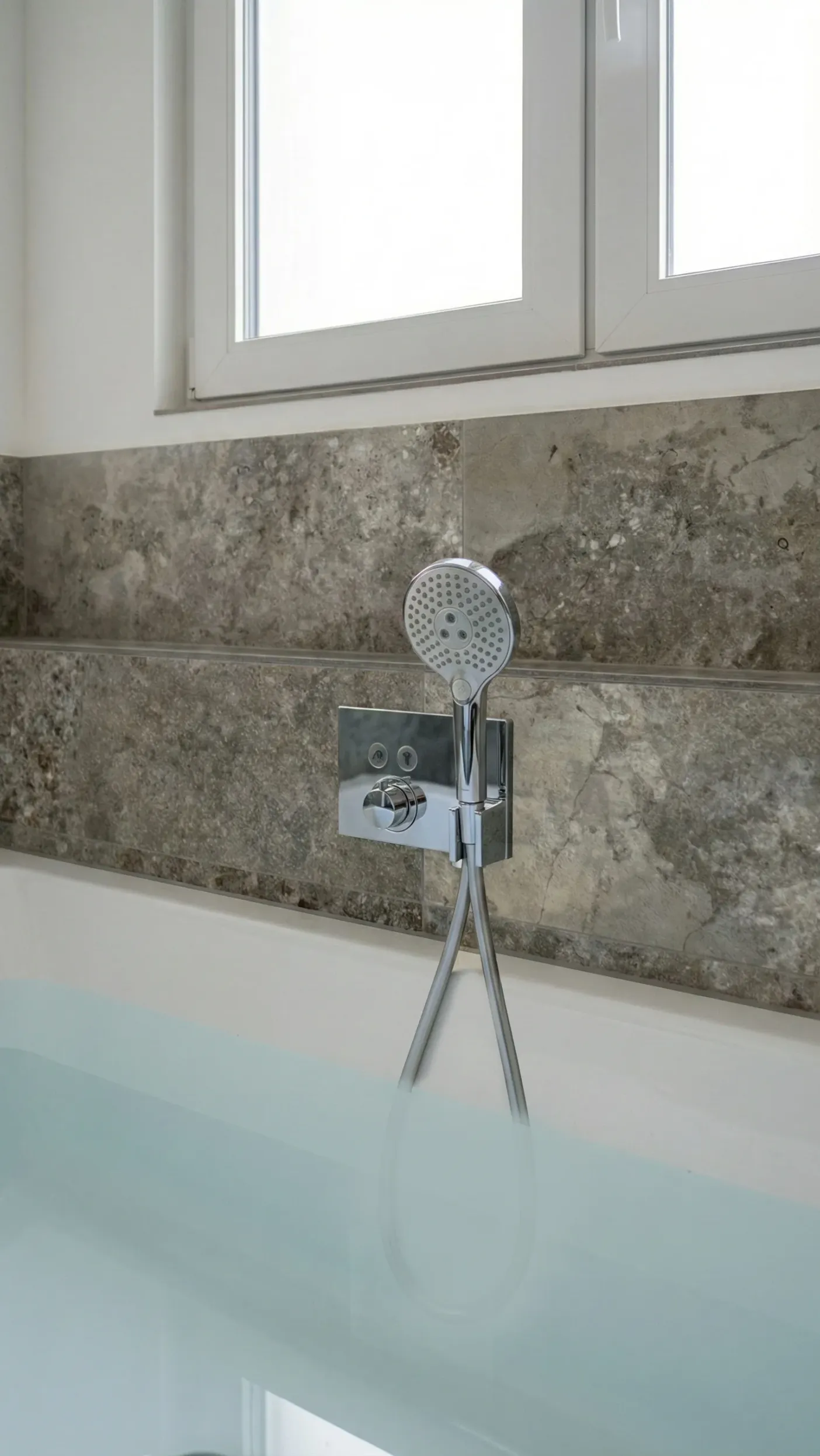 Die Badrenovierung wurde in enger Abstimmung mit dem Kunden geplant und mit höchster Präzision umgesetzt. Im Mittelpunkt standen eine klare Raumstruktur, die Auswahl natürlicher Materialien und die Integration hochwertiger Technik. Durch die Kombination aus dunklem Boden, steinähnlichen Wandbelägen und weißen Sanitärelementen entstand ein Bad mit ruhiger, eleganter Atmosphäre. Die Beleuchtung wurde gezielt eingesetzt, um Funktionalität und Stimmung harmonisch zu verbinden